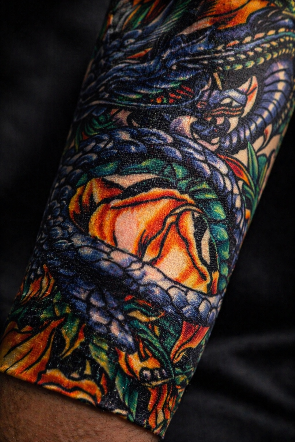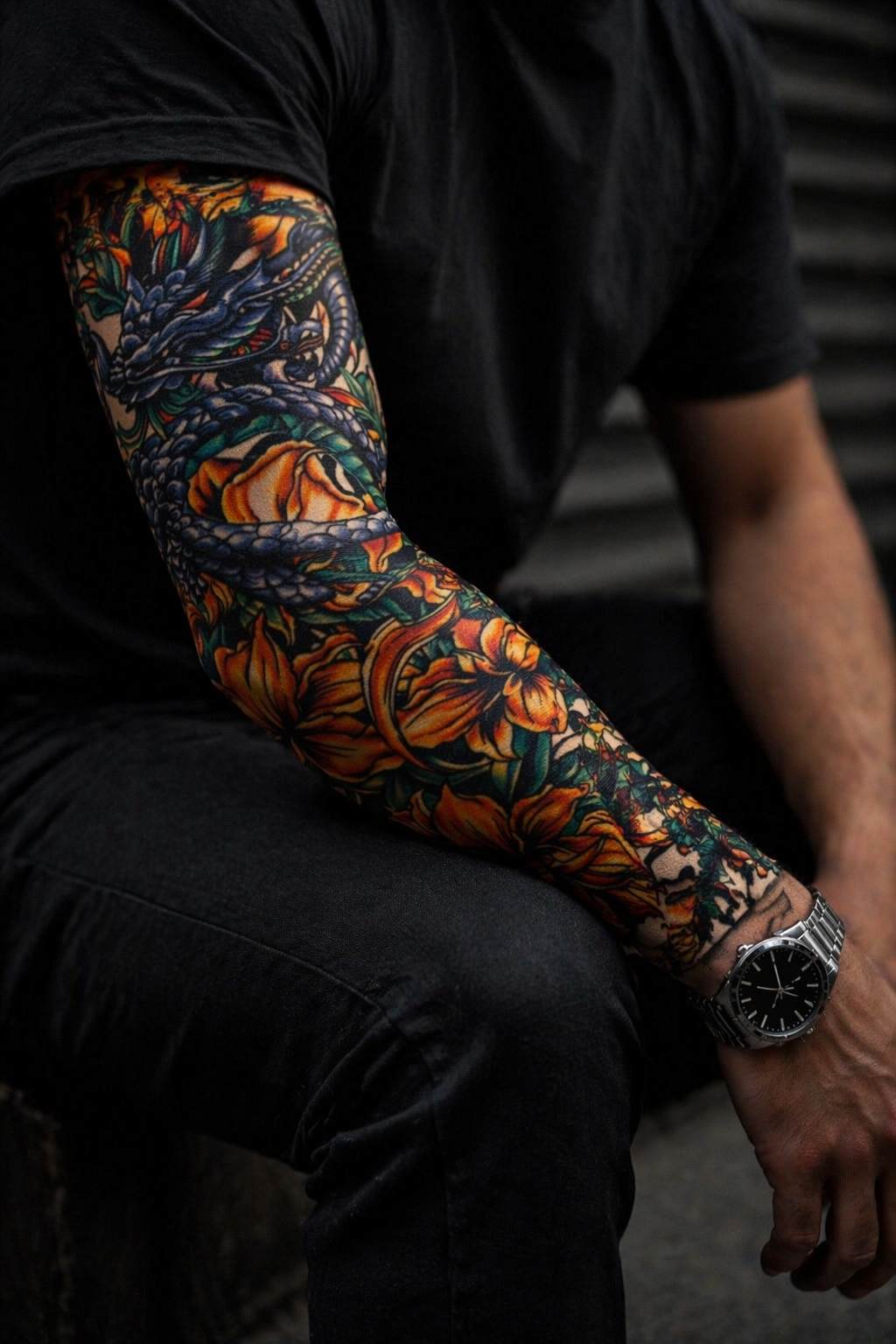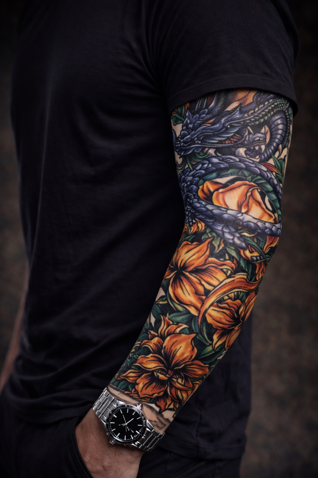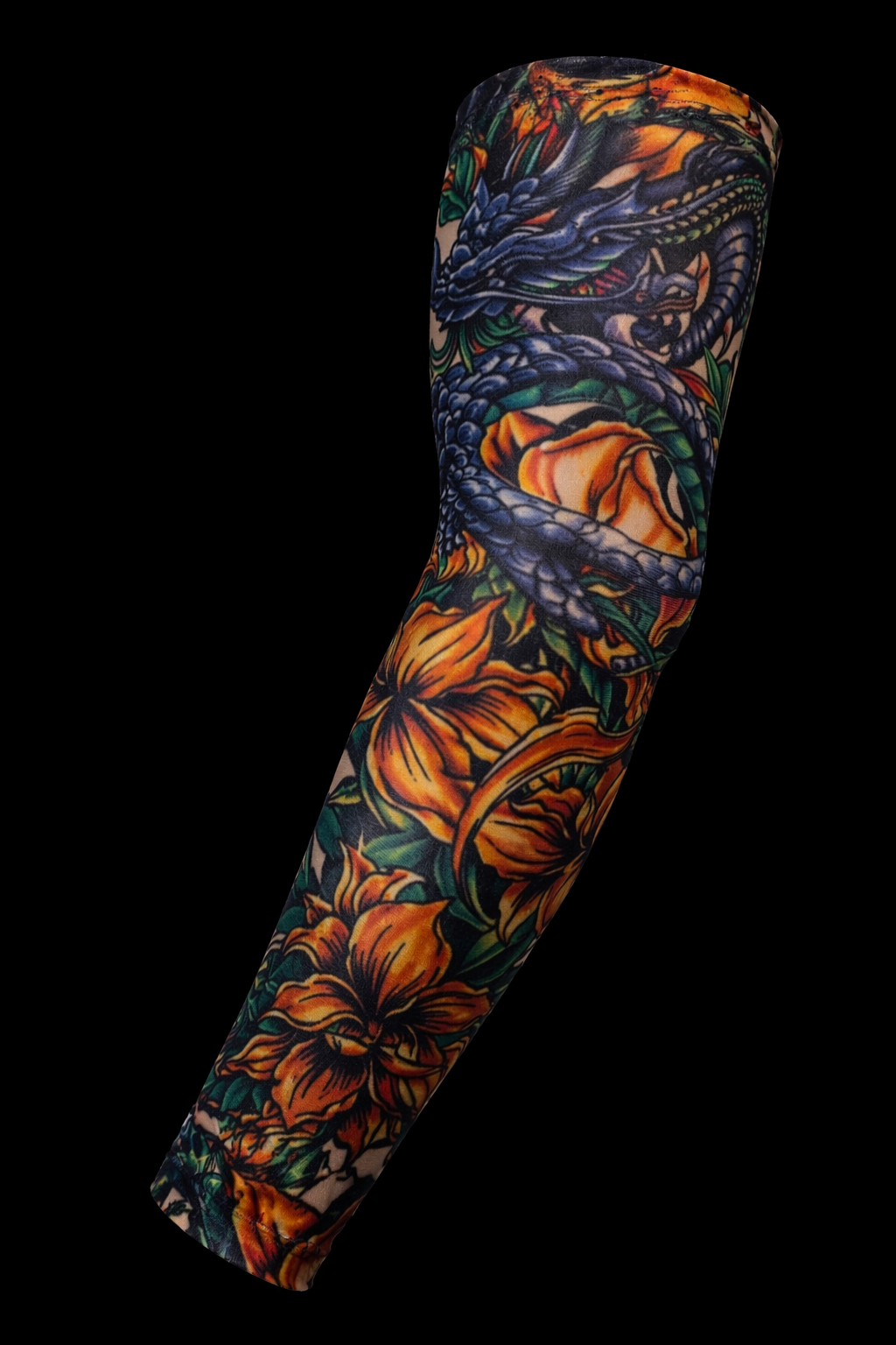 Unleash the power of ancient mythology with the Imperial Dragon Sleeve. This striking full-arm tattoo sleeve features a fierce, highly detailed dragon coiled around vibrant orange and gold flowers — a bold fusion of strength and beauty.